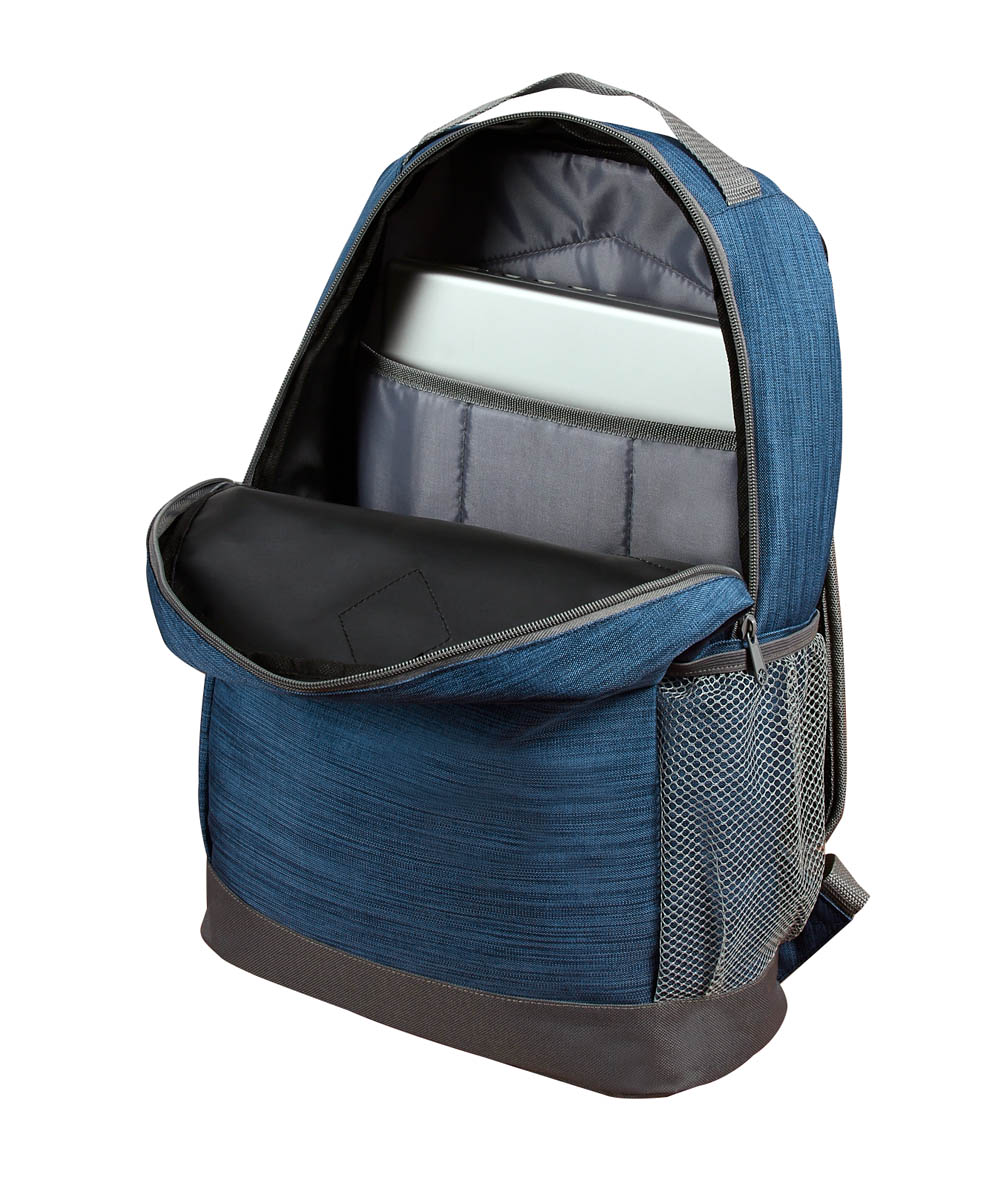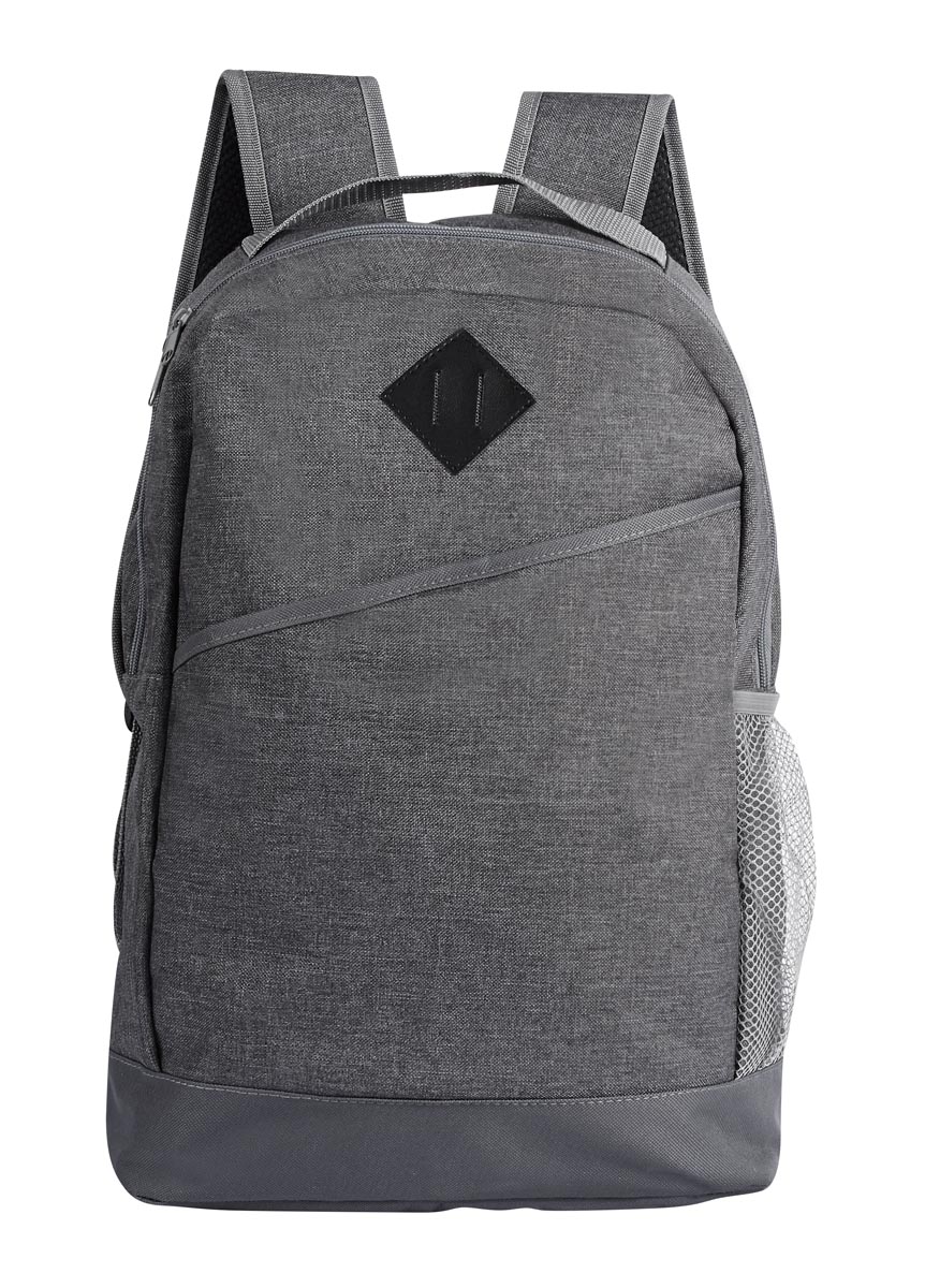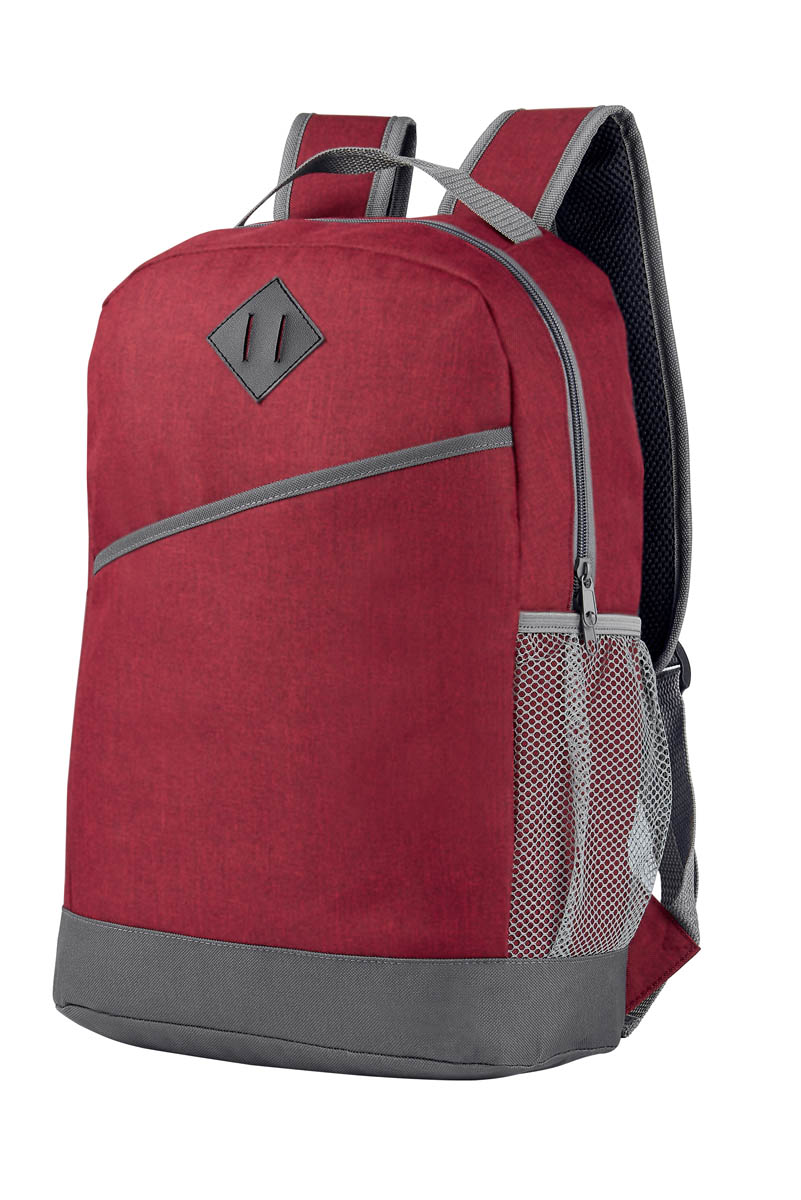 Mochila porta laptop. Bolsa principal y bolsa lateral con malla de colores azul, roja y gris