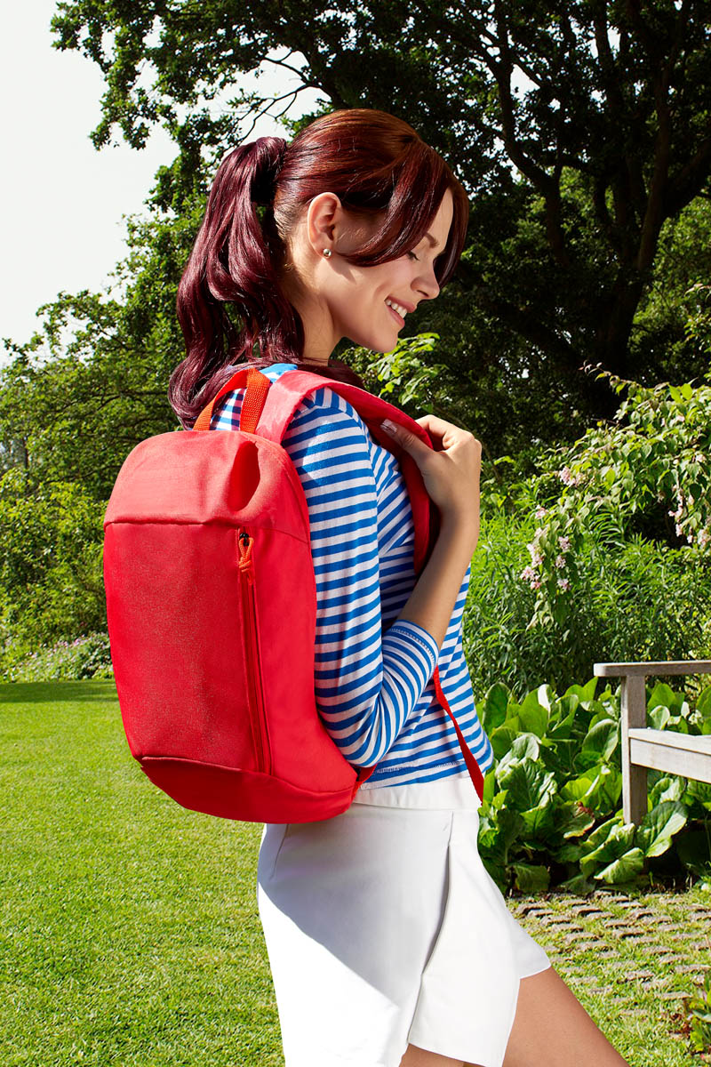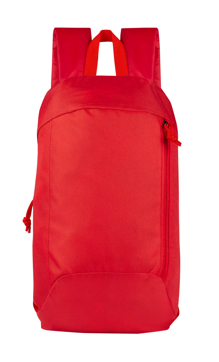 Mochila con bolsa principal y frontal de tela contra agua de color azul, rojo negro