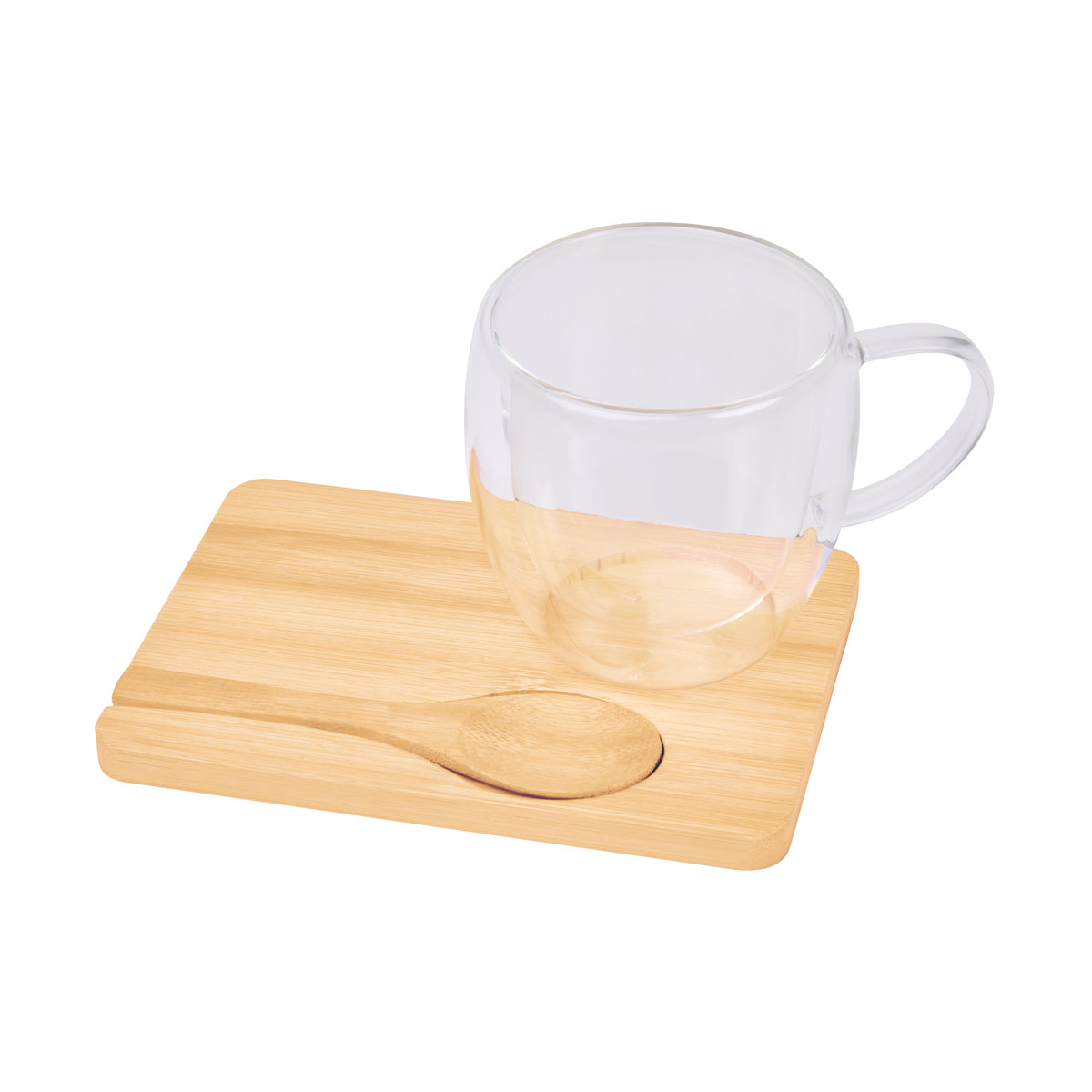 octubre 13, 2024Taza doble pared de vidrio resistente a bebidas calientes y frias con base y cuchara de bambú. Cap. 250 ml