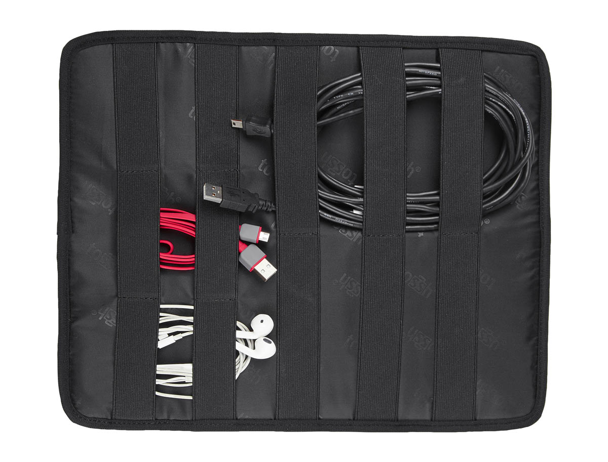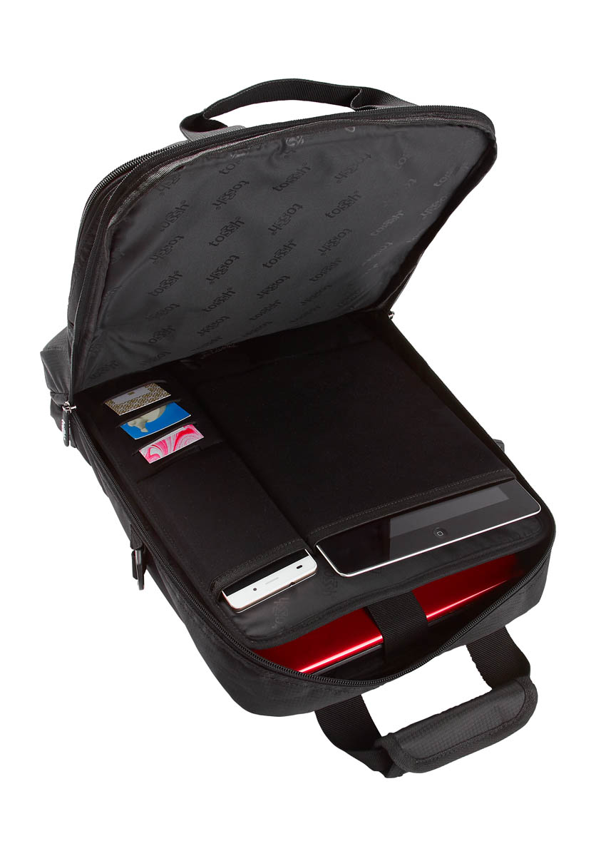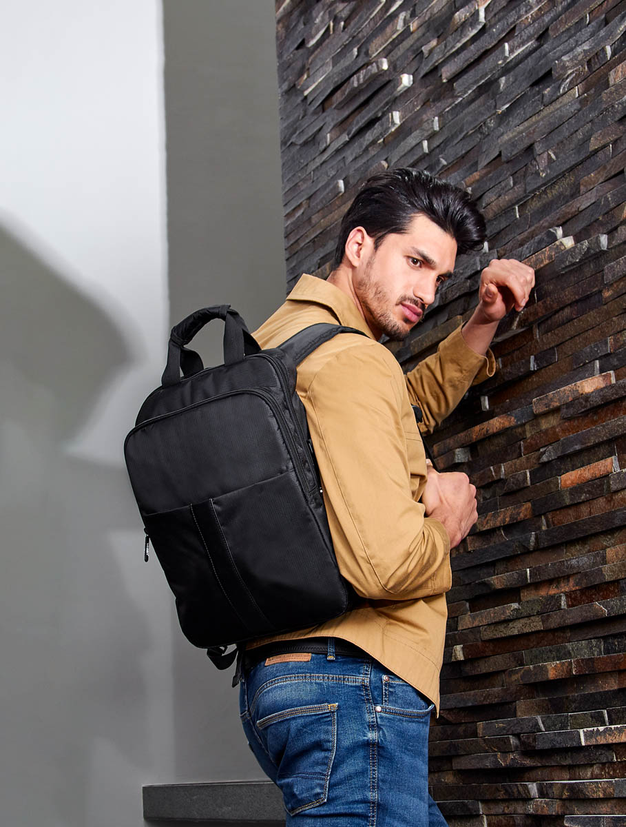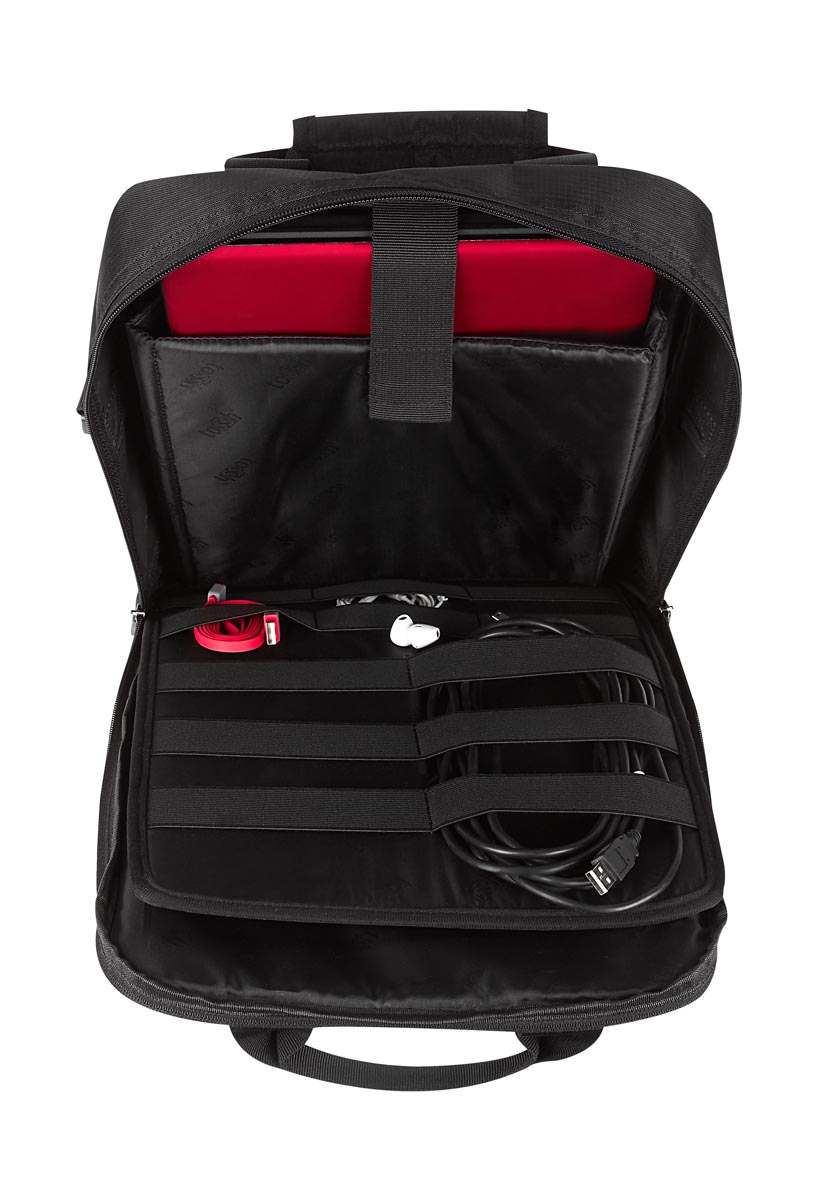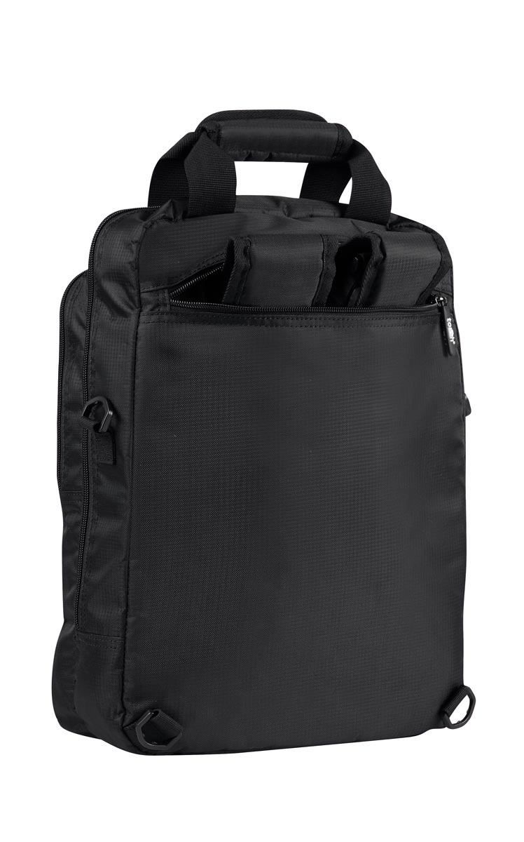 Mochila. 2 Bolsas frontales. Bolsa frontal con cierre en forro para facilitar bordado. Bolsa principal con espacio para laptop y organizador de cables y documentos removible. Parte trasera con cierre para esconder tirantes removibles. Incluye asa para colgar en hombros en color negro