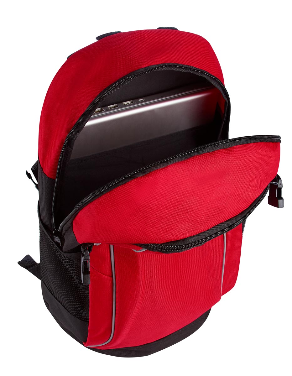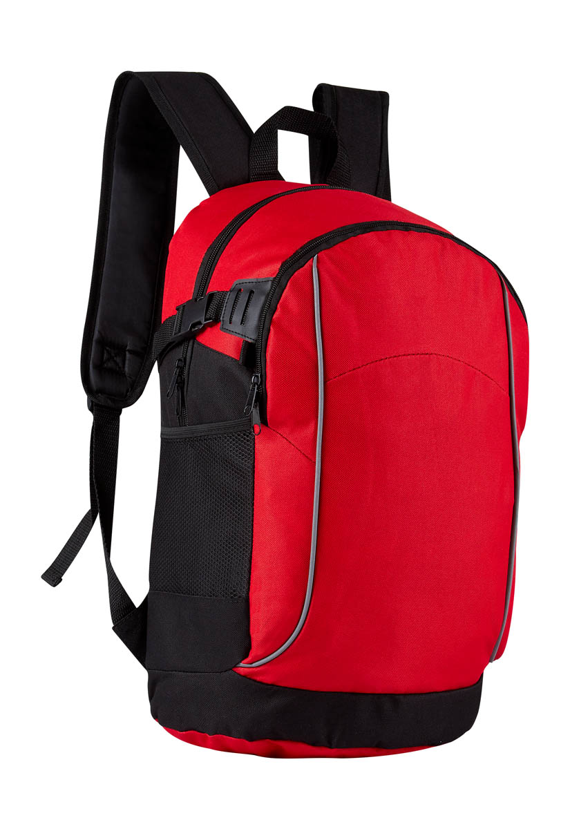 Bolsa principal, frontal y laterales de malla de colores azul y rojo