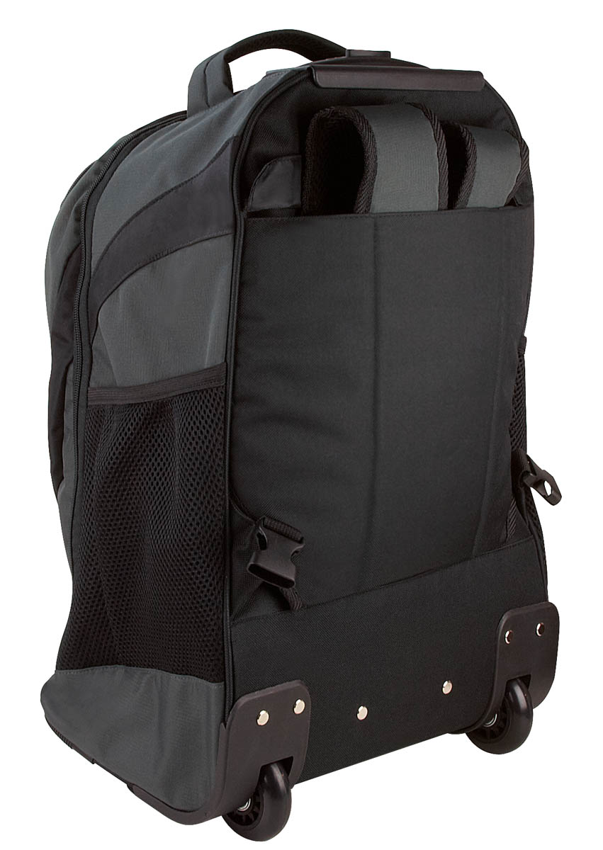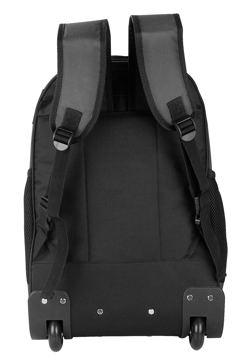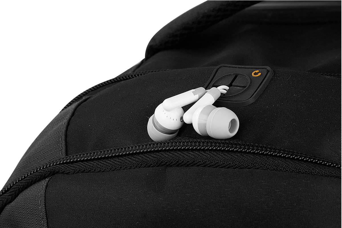 Mochila. Bolsa frontal con compartimento, aditamento especial para audífonos, compartimento para resguardo de tirantes, dos bolsas laterales de red y espacio para laptop.